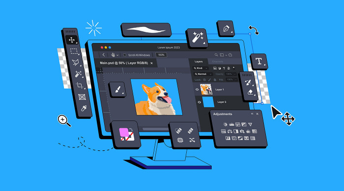 - Projektowania grafik z wykorzystaniem pędzli, gradientów i obiektów inteligentnych